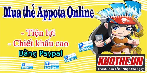 Mua thẻ Appota bằng Paypal tại khothe.vn thanh toán an toàn và nhận thẻ ngay sau 3 phút thanh toán thành công. Hệ thống hỗ trợ thanh toán qua cổng thanh toán Onecom (thẻ Visa, Mastercard), tài khoản Paypal, chuyển khoản Commonwealth và ANZ Bank.
